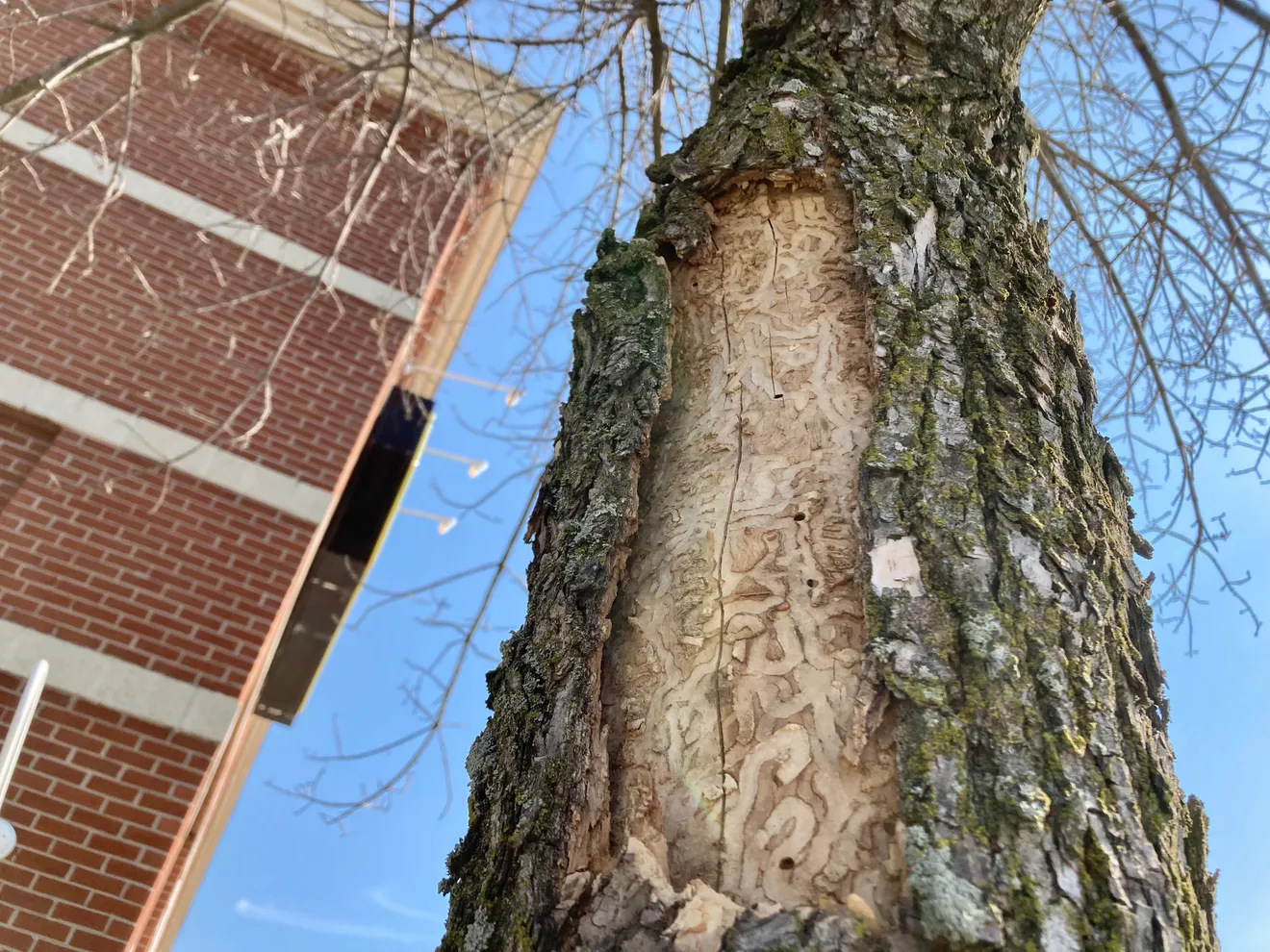 WILLISTON – The small ash tree to the right of Best Buy’s front doors in Williston is now only a skeleton. Pealed back bark reveals a maze of squiggly lines, a signature calling card from ash trees’ worst enemy: the emerald ash borer.